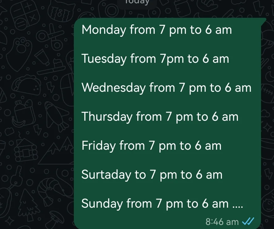 Monday to Sunday ....from 7 pm to 6 am